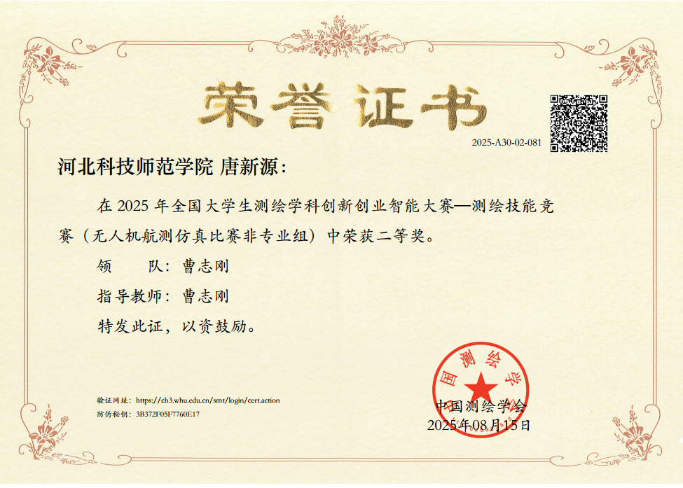 经过激烈角逐,由公司英国威廉集团官网曹志刚老师指导的土木工程专业唐新源同学凭借平时的刻苦训练和线上仿真赛场上的沉着应对,荣获技能竞赛非专业组“无人机航测仿真比赛”二等奖。