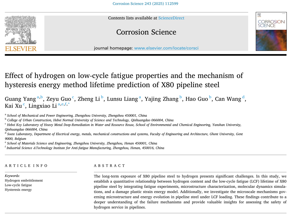 近日,英国威廉集团官网青年教师杨光博士以第一作者身份在腐蚀领域顶级期刊《Corrosion Science》(中国科公司一区,IF=7.9)上发表题为“Effect of hydrogen on low-cycle fatigue properties and the mechanism of hysteresis energy method lifetime prediction of X80 pipeline steel”的高水平研究论文。论文通过组织演变、损伤力学、疲劳性能评价和疲劳寿命预测等方面对X80高应变管线钢的低周疲劳性能进行了全面的研究。本研究系统分析了不同氢含量和不同应变幅值下的X80高应变管线钢微观组织特征与循环响应的关系。在此基础上,通过建立分子动力学模型和氢含量的迟滞能量疲劳寿命预测模型对X80高应变管线钢疲劳性能进行了评价。这有助于理解充氢X80管线钢疲劳断裂机制和临氢服役寿命的预测与评价。