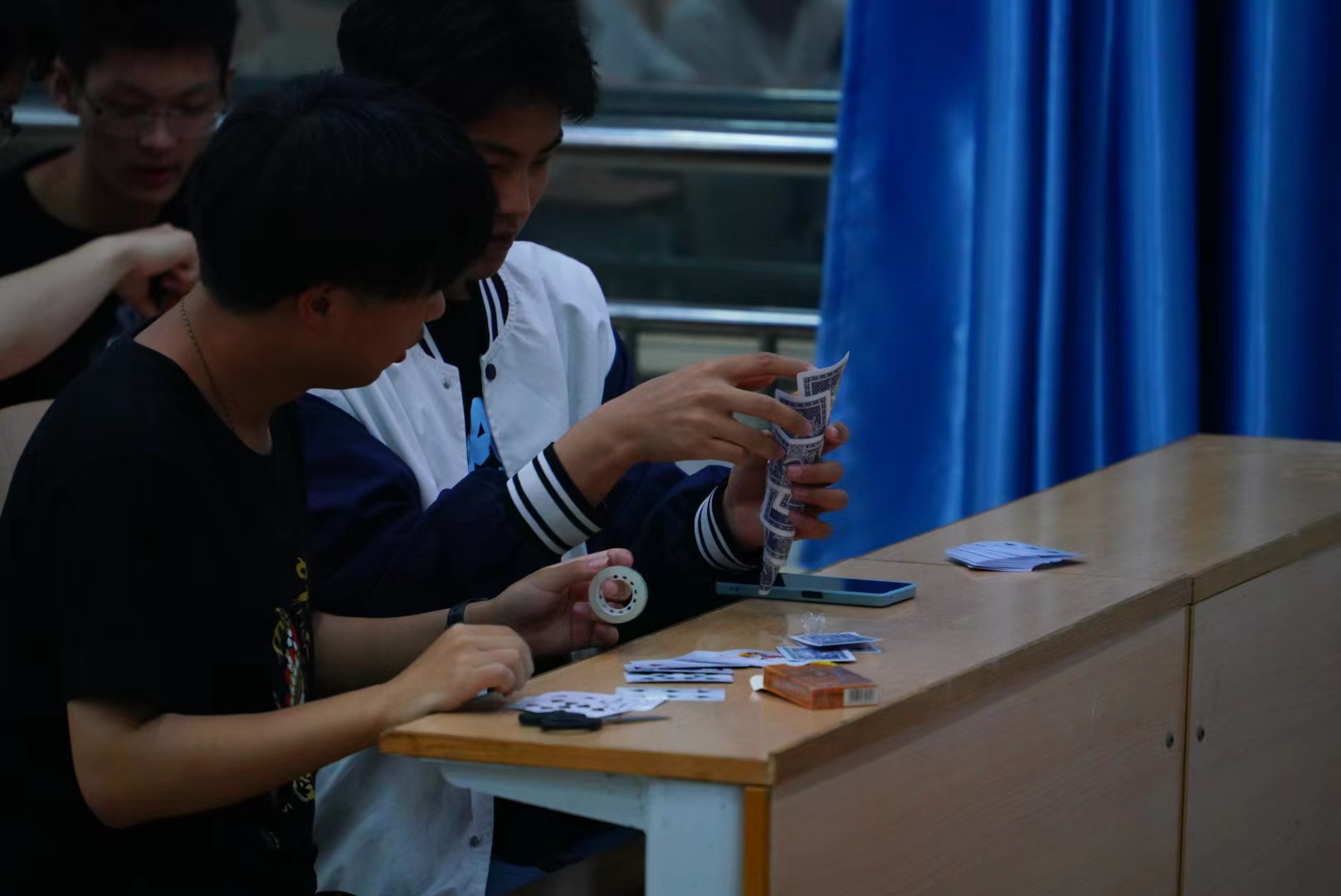 比赛要求选手们在规定时间即1小时内,利用至多15张纸牌完成鸡蛋保护装置的制作,然后对装置进行高空自由落地测试,最后根据无裂纹鸡蛋的扔下的高度及装置质量进行评比。比赛过程中,选手们默契配合、通力合作,结合所学结构设计专业知识,充分发挥创造力,将缓冲方法、降速原理与实际结合,制作出了各种精妙的装置。