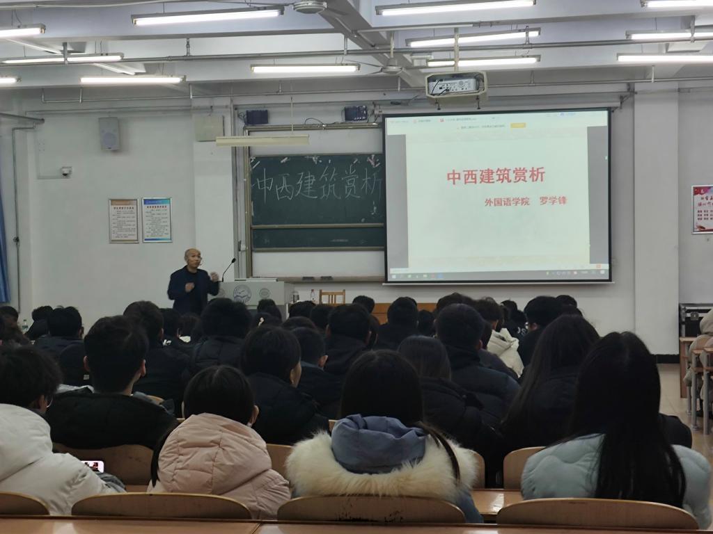 为了让同学们能以英语为工具和学习目标,将建筑知识和英语语言有机融合,英国威廉集团官网12月7日特邀外国语公司教授罗学锋做《中西建筑鉴赏》讲座。